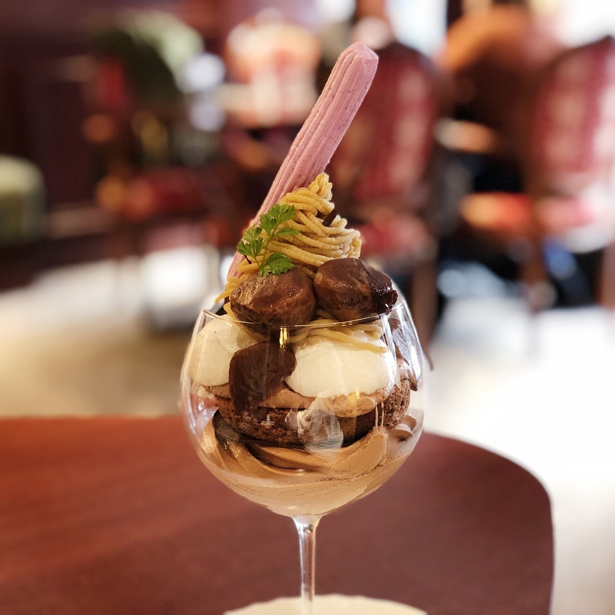 グランサイズは相変わらずのブルゴーニュなグラスでした。見た目の重厚感もさることながら、丸みを帯びた底にしっかりとチョコレートのビスキュイ?とソフトクリームが控えるので、やはり食べごたえがすごいです。そして何よりメインが栗。桃の時と比べても、トータルの重みが。ありますね。間違いなく。